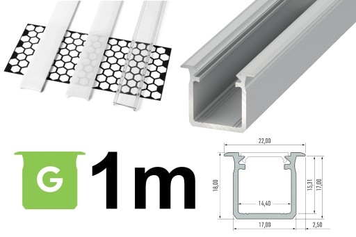 Profil typ G, wpuszczany. Zaprojektowany z myślą o oświetleniu pomieszczeń kuchennych i sklepowych. Świetnie pasuje do montażu wewnątrz szaf, blatów i schodów. Niezwykle ciekawy i nowoczesny design profilu G pozwala wyjść naprzeciw potrzeb klientom jakie niesie zastosowanie taśm LED w tworzeniu linii świetlnych.