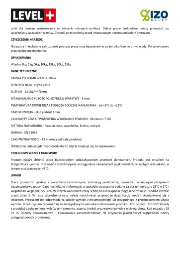 Prace prowadzić zgodnie z warunkami technicznymi, instrukcją producenta, normami i właściwymi przepisami bezpieczeństwa pracy. Dane techniczne i informacje o sposobie stosowania podane są dla temperatury 25°C ± 2°C i wilgotności względnej 55-60%. W innych warunkach czasy schnięcia lub wiązania mogą ulec zmianie. Produkt chronić przed dziećmi. W razie zabrudzenia oczu należy natychmiast przemyć je dużą ilością wody i skontaktować się z lekarzem. Producent nie odpowiada za szkody wynikłe z nieumiejętnego lub niezgodnego z przeznaczeniem użycia wyrobu. Przed użyciem zapoznać się ze szczegółowymi warunkami stosowania produktu. Kod odpadu: 101382 Odpady z produkcji spoiw mineralnych (w tym cementu, wapna, tynku) oraz wytworzonych z nich wyrobów. Kod odpadu : 15 01 05 Odpady opakowaniowe – Opakowania wielomateriałowe. W przypadku jakichkolwiek wątpliwości należy zasięgnąć porady producenta.