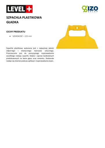 Szpachla plastikowa wykonana jest z najwyższej jakości odpornego i elastycznego tworzywa sztucznego. Przeznaczona jest do precyzyjnego rozprowadzania wszelkiego rodzaju szpachli, klejów i zapraw budowlanych produkowanych na bazie gipsu oraz cementu. Doskonale nadaje się również podczas aplikacji i rozprowadzania żywic.