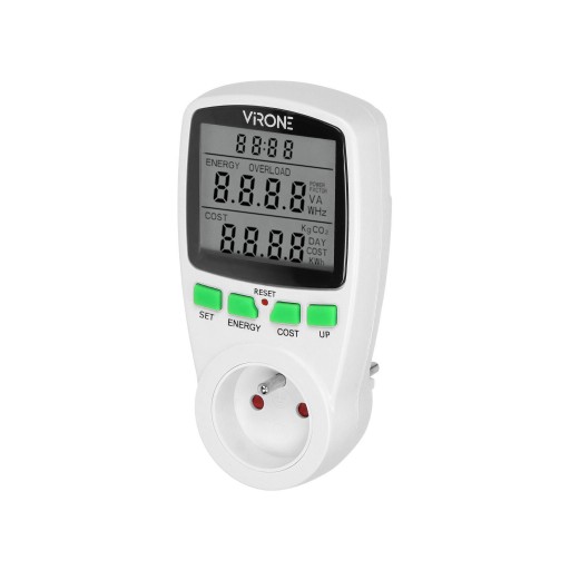 Watomierz umożliwia nam sprawdzenie zużycia prądu elektrycznego i obliczenie kosztów zużytej energii podłączonego urządzenia (obsługuje jedną taryfę). Duży wyświetlacz LCD pokazuje dodatkowo aktualny czas, napięcie i natężenie prądu, współczynnik mocy, częstotliwość, maksymalne obciążenie prądu i ostrzeżenie o przeciążeniu, możliwość wprowadzenia 4 rodzajów waluty.