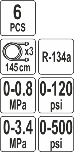 - do obsługi klimatyzacji niskociśnieniowej w zakresie 0-0.8 MPa, 0-120 psi oraz wysokociśnieniowej w zakresie 0-3.4 MPa, 0-500 psi
