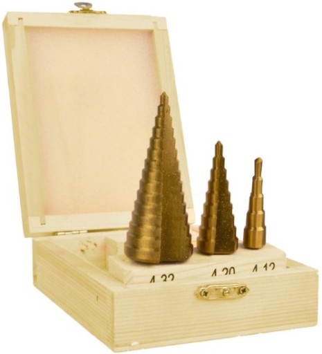 Wiertła stopniowe ze stali HSS powlekanej warstwą tytanu. Pozwalają na wiercenie idealnie okrągłych otworów w stali, mosiądzu, miedzi, aluminium, drewnie i tworzywie sztucznym. Idealne dla blacharzy, elektryków, mechaników samochodowych oraz przydatne w każdym warsztacie przydomowym.
