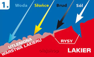 Powierzchnia lakieru nie jest idealnie gładka. Mikro rysy, pory, zarysowania oraz utleniona wierzchnia warstwa lakieru sprzyja szybkiemu przyczepianiu się brudu. Powoduje także utratę połysku i blasku, a z biegiem lat lakier staje się coraz bardziej matowy.