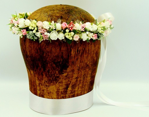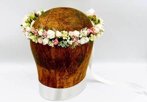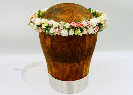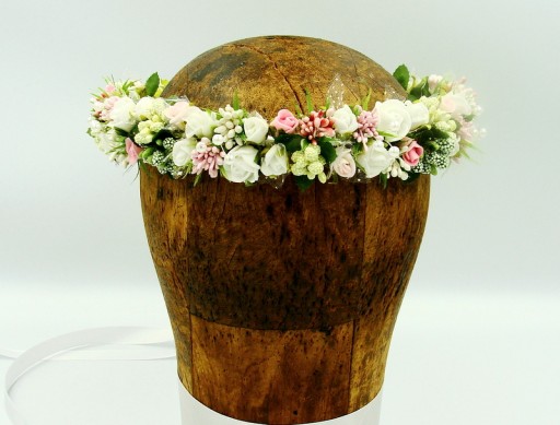 Uroczy wianek wykonany z delikatnych białych i różowych różyczek,