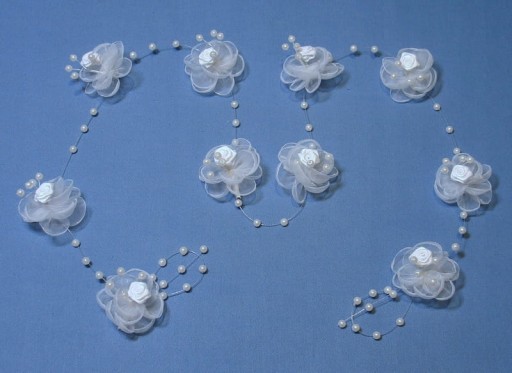 Ręcznie wykonany gałązka z nawleczonymi perełkami. Pomiędzy perełkami umieszczone są organdynowe bukieciki z różyczkami.