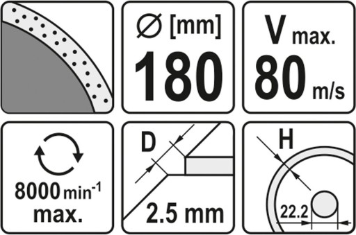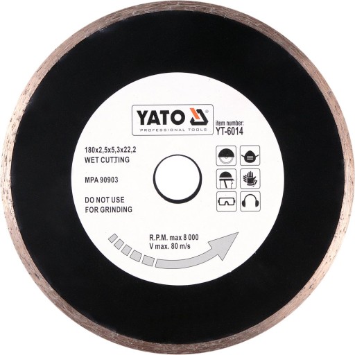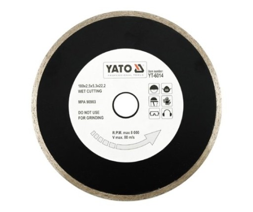 Dane techniczne Numer indeksu YT-6014 EAN 5906083960147 Marka Yato Waga brutto (kg) 0.4080 Master Carton MC 60 Inner Box IB 15 Pal 1440 Średnica zewnętrzna [mm] 180 Średnica wewnętrzna [mm] 22.2 Wysokość segmentu [mm] 10 Zastosowanie Glazura
