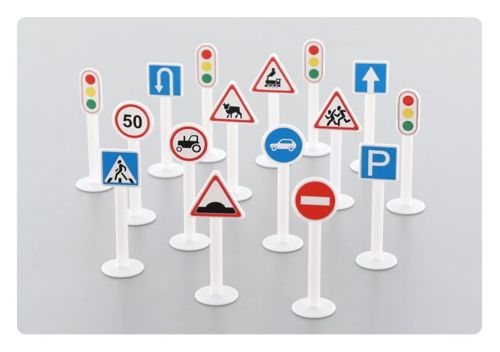 Zestaw 16 znaków drogowych z pewnością urozmaici zabawę samochodzikami każdemu małemu kierowcy, a także zachęci go do poznawania zasad panujących w ruchu drogowym. Stabilne, kolorowe znaki stanowią odzwierciedlenie znaków rzeczywistych.