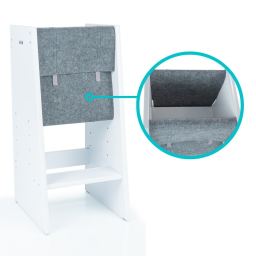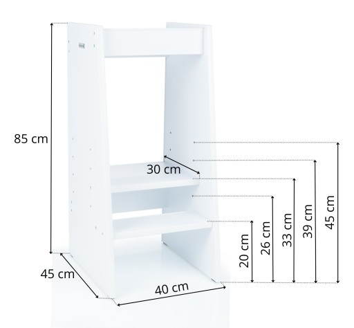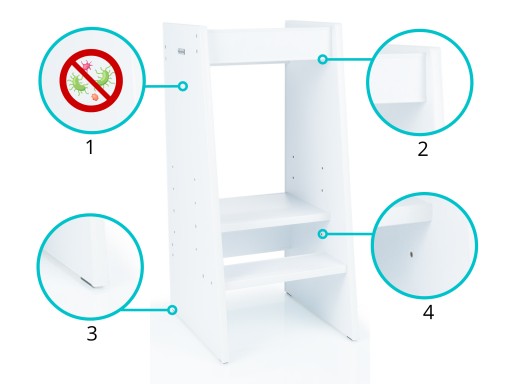 4 - Otwory do zmiany wysokości podestu są na 4 poziomach, aby dopasować wysokość podestu do wzrostu dziecka i wysokości blatu kuchennego.