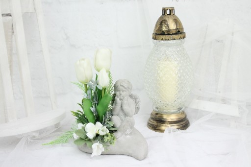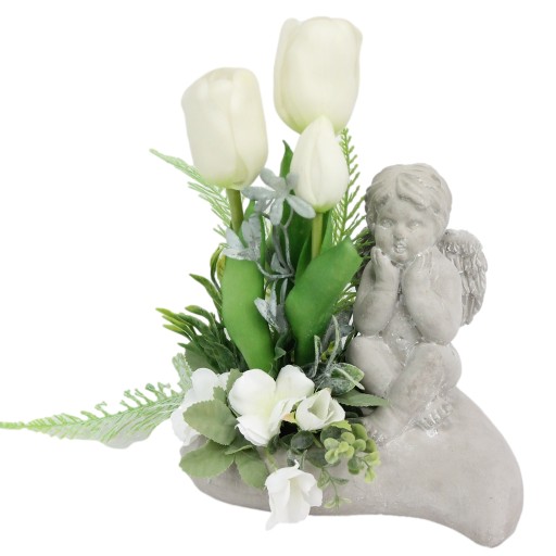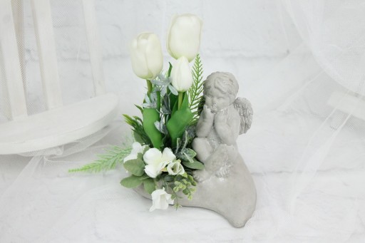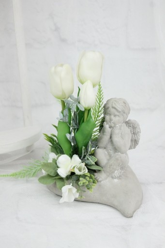Wyjątkowa piękna i niepowtarzalna figurka aniołka jako kompozycja nagrobna w kształcie serca, udekorowana wysokiej jakości sztucznymi kwiatami tulipanów i dodatkami .