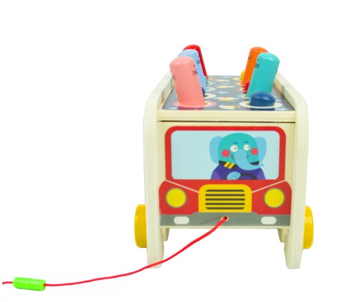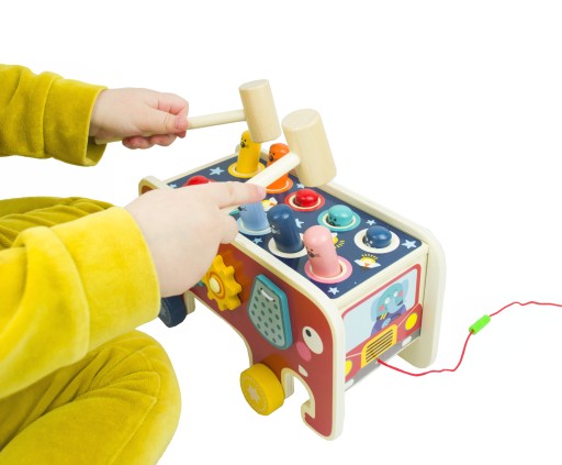 W zestawie znajdują się dwa bezpieczne młoteczki, więc dziecko może bawić się obiema rączkami lub z towarzyszem gry. Młoteczki również są wykonane z drewna, posiadają łagodne krawędzie. Mają długość 15,5 cm. Dziecko bez problemu chwyci je w dłonie.