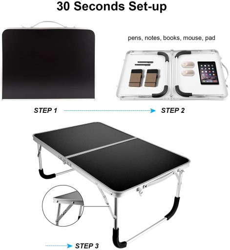 - Oszczędność miejsca: Ten niewielki składany przenośny stół może być złożony w pół rozmiaru po użyciu, co jest wygodniejsze w przechowywaniu. Co więcej, jest ukryta wewnętrzna przestrzeń do przechowywania, która jest idealna na długopisy, notatki, książki, mysz, podkładka itp. Jeśli chcesz go używać, otwieranie zajmuje tylko 30 sekund, co jest bardzo szybkie i wygodne.