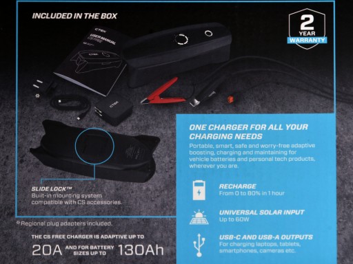 CTEK CS FREE, pierwsza na świecie wielofunkcyjna przenośna ładowarka, została wyróżniona za rewolucyjną technologię Adaptive Boost, która pozwala na uruchomienie samochodu z rozładowanego akumulatora w ciągu 15 minut, a także możliwość doładowania mało używanego samochodu przechowywanego z dala od sieci elektrycznej zasilania i sprytne wprowadzenie akcesoriów umożliwiających ładowanie poza siecią za pomocą energii słonecznej lub drugiego akumulatora serwisowego 12 V.