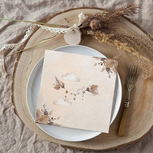 Prześliczne serwetki w neutralnym barwach z nadrukiem zabawek w stylu boho. Świetny wybór na przyjęcie urodzinowe dziecka. Prezentują się niezwykle pięknie w połączeniu z pasującymi kolorystycznie dodatkami.