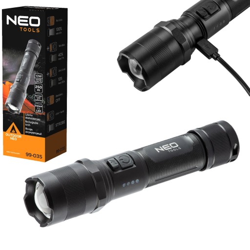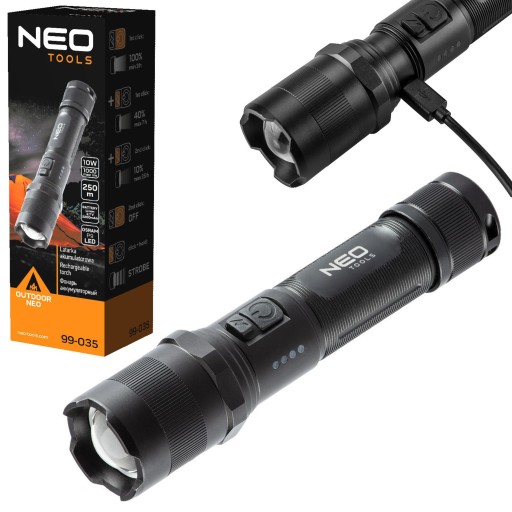 latarka NEO charakteryzuje się solidną konstrukcją. Korpus wykonany jest z aluminium. Wyposażona jest w nowoczesne diody LED OSRAM P9 o strumieniu świetlnym 1000 lumenów i mocy 10W. Latarka posiada 4 funkcje świecenia: 100% / 40% 10% oraz stroboskop. Produkt posiada szeroki zakres zastosowań, np.: dom, samochód, piwnica, biwak. Zgodność z europejskimi standardami bezpieczeństwa zapewnia certyfikat CE.