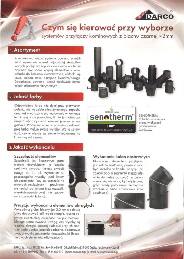 - Elementy systemu są spawane laserowo pokryte czarną farbą SENOTHERM - bezwonną, żaroodporną, łączone kielichowo.