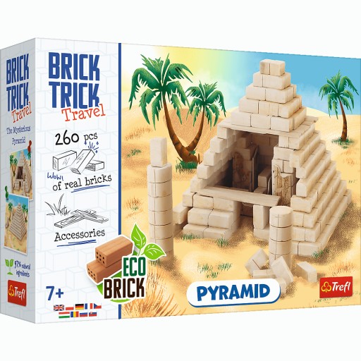 Czy lubisz tajemnicze miejsca i ciekawe historie? Dla wszystkich pasjonatów podróży po świecie powstała seria Brick Trick Travel, dzięki której odkryjesz wnętrze tajemniczej Piramidy! Już dziś przenieś się w zamierzchłe czasy i zbuduj od podstaw prawdziwą schodkową piramidę. Wykorzystaj ponad 260 wypalanych w temperaturze 1000 stopni Celsjusza cegieł oraz prawdziwe, drewniane deseczki. Użyj tekturowych elementów, aby ozdobić ściany wykutymi hieroglifami. To nie wszystko! Na koniec pomaluj konstrukcje dołączonym pigmentem nadając jej niepowtarzalny klimat. Zostań budowniczym i zbuduj starożytne schody, uważaj na niebezpieczne pułapki w komnatach, na szkielety i mumie, chroń skarby Faraona przed rabusiami grobów.