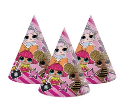 7. Czapeczki papierowe LOL Surprise - 6 sztuk (wysokość 16cm, średnica 10cm, posiada gumeczkę do mocowania).