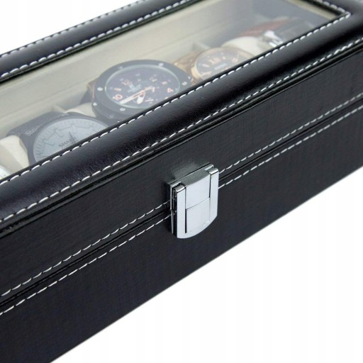 Solidne, eleganckie pudełko na 6 zegarków. Wykończone eko skórą. Można w nim przechowywać zegarki lub po wyjęciu poduszeczki biżuterię lub inne drobiazgi. Zamykane na zatrzask - chroni przed przypadkowym otwarciem i wysypaniem zawartości.