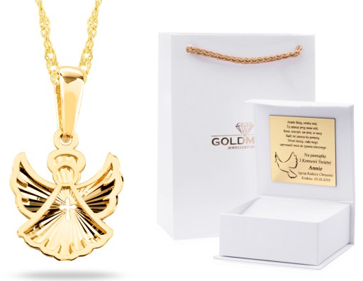 Złoty komplet, medalik z łańcuszkiem w całości wykonane ze złota próby 585. Zestaw idealnie nadaje się na takie okazje jak Chrzest Święty lub Komunia Święta. Dzięki bezpłatnemu grawerunkowi prezent stanie się jeszcze bardziej indywidualny. Biżuteria oferowana przez nas jest najwyższej jakości. Zdjęcia są naszego autorstwa, przedstawiają dokładnie ten produkt, który kupujesz! Do każdego zakupu otrzymasz gratis wybrane pudełko wraz z grawerunkiem.