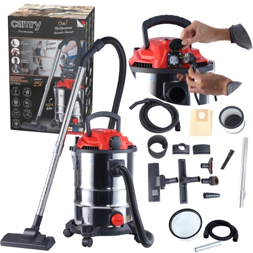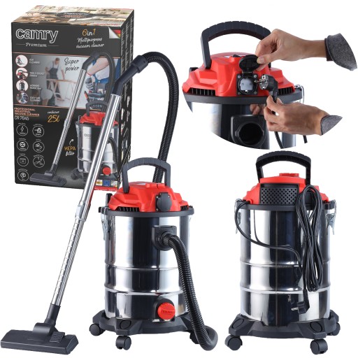 Profesjonalny odkurzacz przemysłowy z gniazdem elektrycznym CAMRY CR 7045 to produkt, który sprawdzi się w mieszkaniu, domu, garażu, warsztacie i tarasie, ale również, jako sprzęt użytkowy w firmie sprzątającej. Maksymalna moc 3400 W i siła ssąca 20 kPa pozwolą na szybkie odkurzenie wszystkich pomieszczeń nawet z trudnych zabrudzeń. Ułatwi to też ogromny zasięg pracy do 19 m, a wszystko to przy poziomie hałasu na wysokości 82 dB. Odkurzacz wyposażony został w ogromny zbiornik na nieczystości o pojemności 25 litrów, co pozwala na długie odkurzanie bez konieczności opróżniania pojemnika. Wysokiej jakości elementy wykonane ze stali, jak rura teleskopowa, oraz ponad dwumetrowy plastikowy wąż z wygodnym uchwytem pozwalają na swobodną kontrolę pracy odkurzacza. Poza tym odkurzacz ma cztery filtry, które pozwalają zadbać o jakość powietrza w odkurzanych pomieszczeniach.
