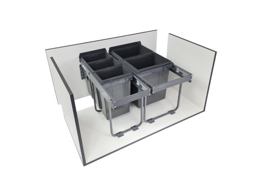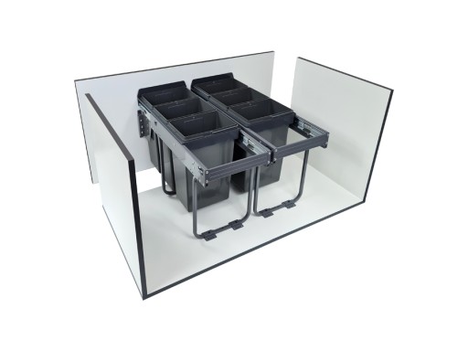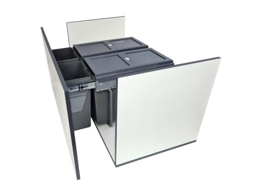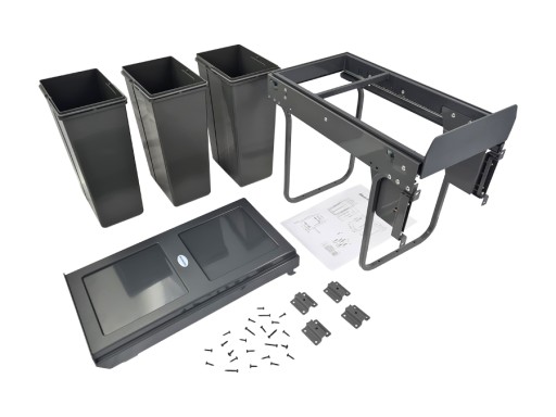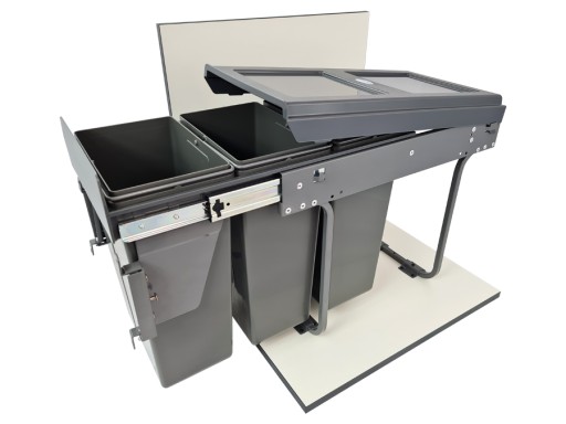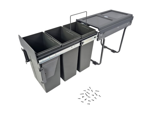 Sortownik na Śmieci Potrójny, z prowadnicami kulkowymi z Pełnym Wysuwem, Cichym domykiem, Mocowanie Frontu Regulowane w Trzech Płaszczyznach.