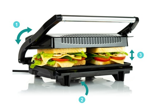 - Górna płyta automatycznie dostosowuje swoją wysokość do opiekanego produktu.