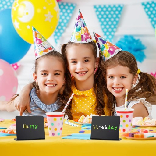 Zestaw zawiera 12 małych tablic kredowych, 4 pisaki do tablic: czerwony, biały, żółty, zielony i dwie szare ściereczki do czyszczenia. Nie ma potrzeby kupowania dodatkowych pisaków do tablic. Za pomocą ściereczki te pisaki do tablic można łatwo wytrzeć do czysta lub umyć wodą, co czyni je idealnym przedmiotem wielokrotnego użytku.
