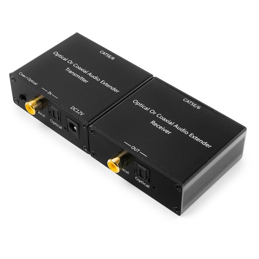 Transmiter audio umożliwiający przesyłanie dźwięku optycznego Toslink lub cyfrowego (Coaxial) za pomocą kabla LAN cat5E lub cat6 na odległość do 150 metrów. Jedynie nadajnik wymaga zasilania DC12V (zasilacz w zestawie) i posiada wskaźnik LED