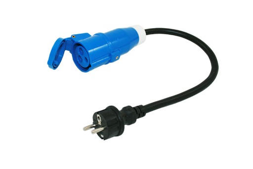 Kabel Schuko CEE gniazdo 230V do podłączenie kempingów pod zasilanie 230V Gumowy przewód H07RN-F 3G2, 5 Testowany zgodnie z VDE / GS Norma Klasa szczelności: IP44 Kabel 3x2, 5m ². Długość przewodu: 50 cm W ofercie również adaptery z przewodem 150 cm