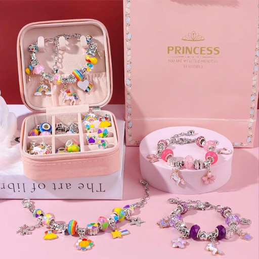 Prawie każda dziewczynka uwielbia biżuterie, błyskotki, koralki, zawieszki. Prezentowany zestaw do tworzenia bransoletek jest idealnym prezentem dla małej księżniczki, która zamieni się w prawdziwą kreatorkę mody.