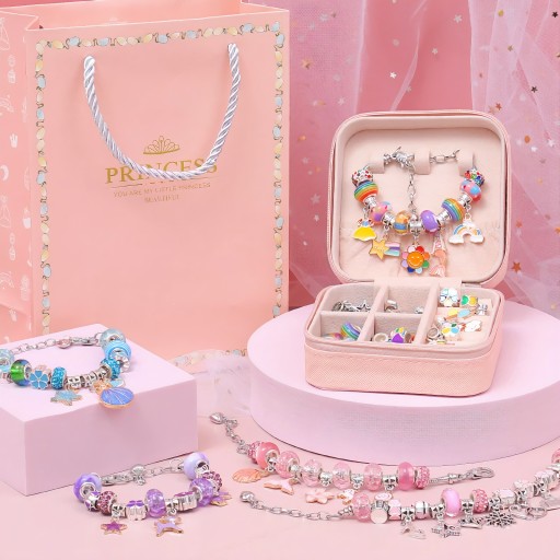 Prawie każda dziewczynka uwielbia błyskotki, koralki, zawieszki. Prezentowany zestaw do tworzenia bransoletek to dokonały prezent dla małej księżniczki, która zamieni w prawdziwą kreatorkę mody. Dzięki koralikom dziewczynki pobudzają swoją wyobraźnię i tworzą własnoręczną biżuterię.