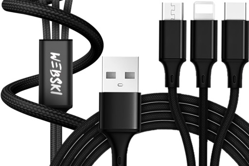Mocny, pleciony, nylonowy kabel USB z trzema różnymi rodzajami końcówek WEBSKI® PRO Series.