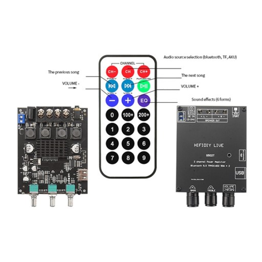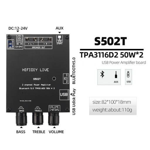 TPA3116D2 Bluetooth 5.0 HIFI 2.0 moc kanału Audio Stereo płyta wzmacniacza 50W + 50W tonów wysokich uwaga strojenia AMP S502T TPA3116D2 2.0-kanałowy wzmacniacz mocy z 5.0 funkcja Bluetooth (brak sygnału blokującego w promieniu 10 metrów), funkcja stereo, która może regulować oddzielną regulację częstotliwości wysokich kanałów stereo, regulację częstotliwości basów, regulację głośności!S502T dodaje funkcje odtwarzacza USB1.TPA3116D2 50W + 50W:1. Wersja Bluetooth: 5.0 (bez ochrony przeciwsłonecznej, 10 metrów)2. Kanał wyjściowy: kanał 2.03. model układu scalonego: TPA3116D21. Tryb pracy: klasa D2. Prąd statyczny: 60mA3. Wydajność pracy: 90%4. Wejście Audio: obsługa bluetooth, sygnał analogowy AUX5. Maksymalna wydajność moc: 50Wx26. Pasmo przenoszenia: od 20Hz do 20KHz7. Napięcie robocze: DC12V - 24V8. Zalecane napięcie zasilania: DC19V9. Dopasuj parametry głośnika: 4-8 omów10. Rozmiar: 110mm x 70mm x 21mmMateriał: tworzywo sztuczneKolor: czarnyZawartość opakowania:1 x płyta wzmacniaczaTylko powyższa zawartość opakowania, inne produkty nie są uwzględnione.Uwaga: odbicie światła i różne wyświetlacze mogą spowodować, że kolor przedmiotu na zdjęciu będzie trochę inny niż rzeczywist
