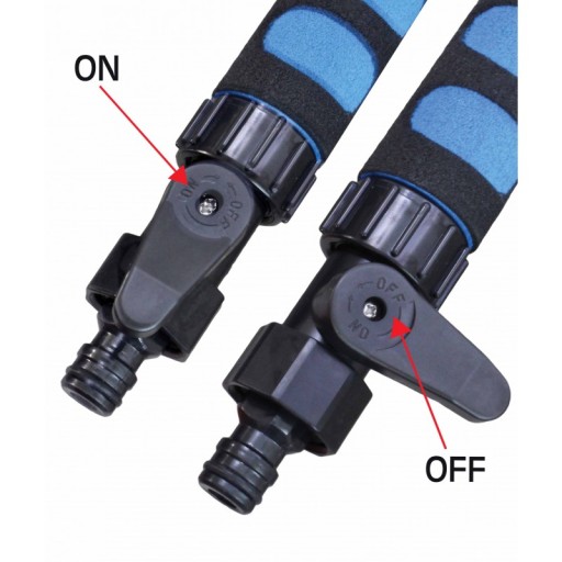 Szczotka posiada bezpośrednie podłączenie do węża ogrodowego co zaoszczędza czas, a zawór umożliwia regulację natężenia przepływu strumienia wody.