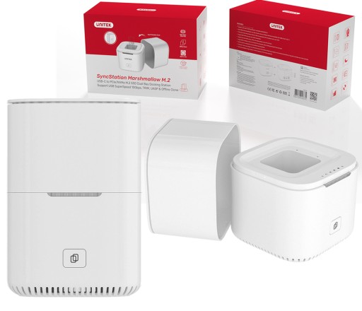 Stacja jest kompatybilna z dyskami SS2 42/60/80 mm, zarówno z kluczem M, jak i B + M. Możliwe jest stosowanie dysków o pojemności do 16 TB. Nie potrzebujesz komputera do klonowania danych między dwoma dyskami – wystarczy, ze umieścisz je w stacji. Instalacja dysków jest beznarzędziowa. Aby rozpocząć proces klonowania danych wystarczy przytrzymać frontowy przycisk minimum 3 sekundy. Postęp całego procesu widoczny jest na diodach LED. Po pół godziny bezczynności stacja przechodzi w tryb uśpienia.
