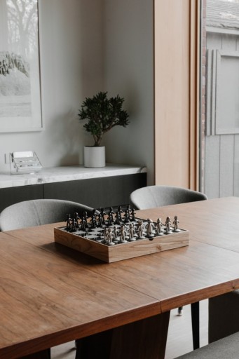 Szachy Umbra łatwo przechowywać - figury schowasz do wytłoczki wewnątrz skrzyni, a ją samą postawisz na boku albo położysz płasko.