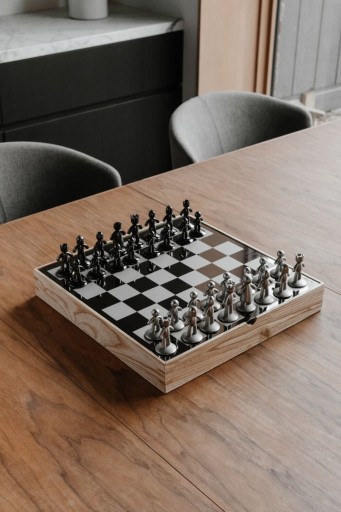 • Zestaw szachów: drewniano-metalowa skrzynia z planszą oraz komplet figur. • Figury w kształcie ludzików odlewane z cynku i malowane (zestaw w ciemnym kolorze). • Spodnia część podklejona materiałem - nie rysują planszy. • Łatwe do przechowywania - wewnątrz skrzyni wytłoczka na figurki. • Pomysł na prezent.