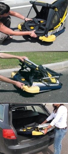 Po dokupieniu dodatkowych akcesoriów przyczepkę można zamienić w praktyczny wózek np do biegania