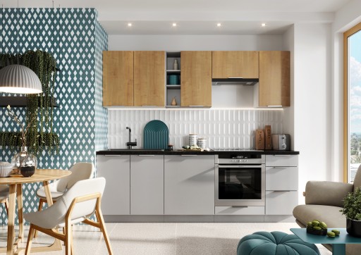 Połączenie estetycznych frontów szafek górnych w kolorze dąb burlington oraz szafek do kuchni dolnych szara platyna. Doskonały wybór dla wszystkich ceniących sobie uniwersalną estetykę.