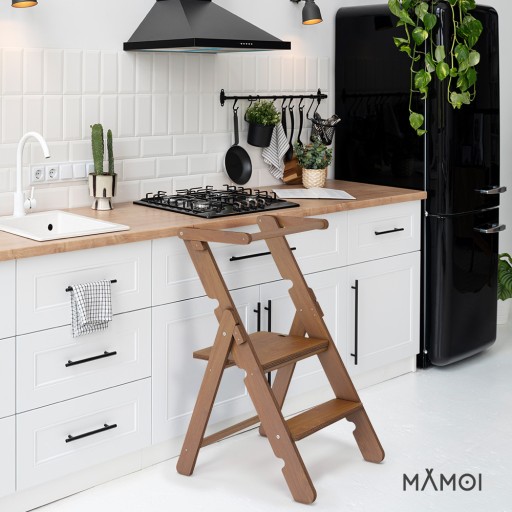Piramidka dla dzieci MAMOI® jest wytrzymałym i bezpiecznym podestem ze stabilnymi dwustopniowymi schodkami. Dzięki kitchen helper dziecko może sięgnąć do stołu lub szafek i z łatwością bawić się lub pomagać rodzicom w gotowaniu. Elementy drewniane są wycięte na CNC i złączone odpowiednimi zawartymi w zestawie śrubami. Wieża posiada poprzeczkę, która chroni Twoje dziecko przed upadkiem.