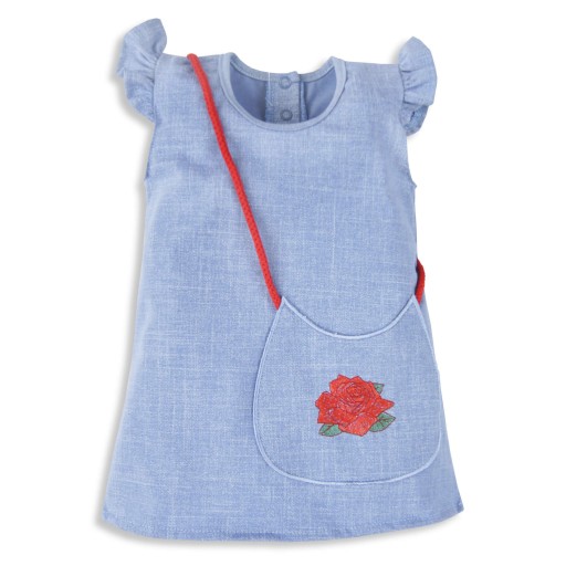 Dziewczęca sukienka na ramiączkach, w kolorze jeansowym. Sukienka została uszyta w Polsce, z miękkiej bawełny 100%. Ramiączka sukienki przyozdobione zostały delikatnymi falbankami. Na sukience znajduje się duża kieszonka z naszywką róży. Do kieszonki doszyty jest czerwony sznureczek imitujący ramiączko torebki. Ubranko zapinane jest na karku, na bezniklowe, antyalergiczne napki. Sukienka ma prosty krój, dzięki czemu sprawdzi się w wielu dziewczęcych stylizacjach.