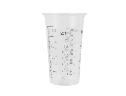 Jednorazowy kubek do mieszania farb i lakierów wykonany z przezroczystego PP o pojemności całkowitej 500ml.