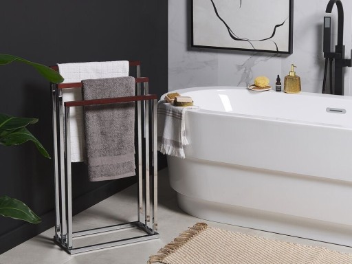 Odśwież wygląd swojej łazienki za pomocą tego stojaka na ręczniki. Sprawdzi się on nie tylko jako ciekawy element dekoracyjny, który przyciągać będzie uwagę dzięki swojemu połączeniu kolorów oraz materiałów, ale posłuży tako jako element użytkowy, oferując dodatkowe miejsce do suszenia ręczników. Jego baza, wykonana ze stali, nie wymaga częstej pielęgnacji, a dodatkową wytrzymałość produktu zagwarantuje drewniane wykończenie poręczy.