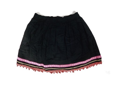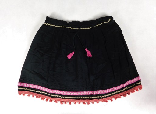 inne: spódnica uszyta z cienkiej tkaniny- wiskoza na cienkiej podszewce-bawełna. Folkowy wygląd- rozszerzana, z kolorowymi taśmami, na dole maleńkie pompony.