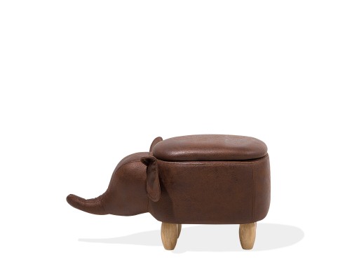 Podaruj swojemu dziecku wspaniałego towarzysza zabaw. Ta pufka, która swoim kształtem przypomina słonia, wykonana jest z wysokiej jakości materiału imitującego skórę. Drewniane nóżki idealnie komponują się z ciemnobrązowym tapicerowaniem, a dodatkowo zapewniają stabilność całej konstrukcji, co pozwala usiąść lub położyć na niej nogi. Całość wyposażona jest także w przestronny schowek, w którym można ukryć inne zabawki lub przydatne drobiazgi. Idealnie wpasuje się w minimalistyczne, skandynawskie wystroje i w mgnieniu oka stanie się ulubionym elementem w pokoju twojego dziecka.