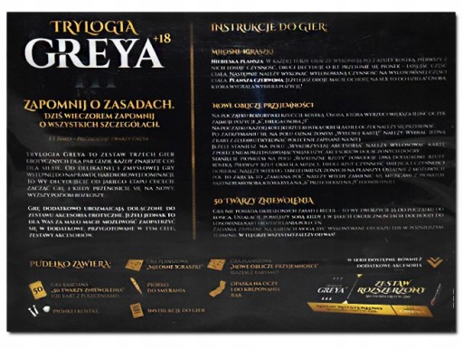 Trylogia Greya to zestaw trzech gier erotycznych dla par gdzie każdy znajdzie coś dla siebie. Od delikatnej i zmysłowej gry wstępnej do naprawdę hardkorowej dominacji.