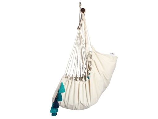 Fotel hamakowy AHC-10 będzie pasował się do każdego wnętrza, a kolorowe frędzle w kształcie dzwonków znajdujące się z przodu fotela dodadzą mu niepowtarzalnego charakteru. Dzięki drążkowi o długości 112 cm fotel nie zajmie zbyt dużo miejsca, a zapewni komfortowe miejsce wypoczynku. Fotel jest wykonany z najwyższej jakości ręcznie plecionej bawełny. Sznurki, które podtrzymują całą konstrukcję są niezwykle mocne, a przy tym delikatne w dotyku. Drążek fotela wykonany jest z impregnowanego drewna, zabezpieczonego przed działaniem czynników zewnętrznych. Bawełna, z której wykonany jest fotel, jest zarówno wytrzymała, jak i przyjazna dla skóry, więc z fotela mogą bezpiecznie korzystać dzieci. Do zamontowania fotela potrzebny jest tylko jeden hak, który montuje się w suficie lub drewnianej belce czy na gałęzi.