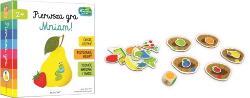 Wprowadź swojego dwulatka w świat gier planszowych! Pierwsza gra Seria gier dla najmłodszych dzieci i ich rodziców. Dwulatek dynamicznie rozwija się poznawczo, emocjonalnie i społecznie. To idealny moment na wprowadzenie pierwszych gier planszowych. Dostarczą one stymulacji w wielu aspektach rozwoju. Mniam! Gracze rzucają kostką i starają się zdobyć jak najwięcej soczystych owoców i warzyw. Gracz, który schrupie ostatni przysmak ze stołu, dostaje w nagrodę owocowy sok. Dzieci poznają owoce i warzywa oraz ich kolory. Naucza się je liczyć oraz porządkować w zbiory. Gra promuje przy okazji zdrowe nawyki żywieniowe.