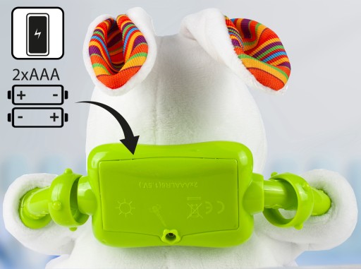 - Przycisk 123 - świeci, wydaje odgłosy śmiejącego się dziecka, króliczek mówi mama i tata oraz nuci piosenki