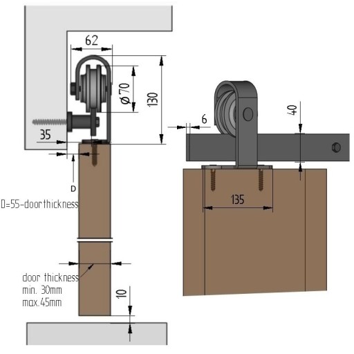 - prezentowany model dedykowany jest do przesuwnych drzwi drewnianych, z płyty, których masa nie przekracza 130 kg, a grubość mieści się w przedziale 30-45 mm